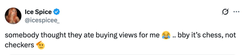 Her tweet quickly went viral, with many debating what she actually meant. Some took it as confirmation that someone outside her team — perhaps a troll or overzealous fan — had artificially boosted the video’s views. Others saw it as a tongue-in-cheek clapback, implying that Ice Spice was fully aware of how to play into the controversy.