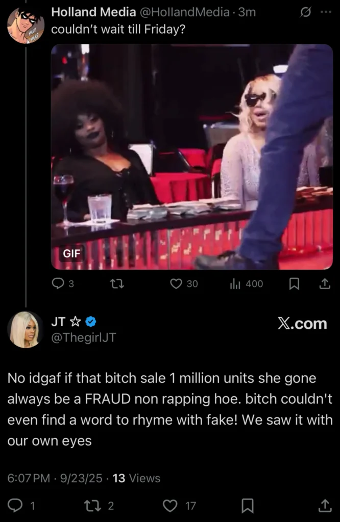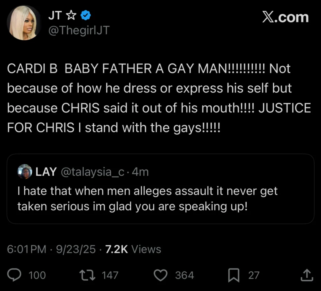 JT shared a clip of the interview on X (formerly Twitter) earlier this week, using it to take aim at Cardi B’s relationship with Diggs. “This is f*cking NUTTS & sad! Gay men should be protected, I feel like this isn’t being taken seriously enough!” she wrote.