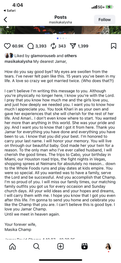 Since then, Masika has expressed how truly heartbroken she is over losing her husband. She has been married for about ten years and having two children. Masika confirmed, letting the world know the loss she was facing. Masika posted a heartfelt love letter and goodbye to her late husband. They were married in 2021 and even though, they had faced challenges but she still was devoted and loyal to their marriage. She expressed her deepest sympathies with her heartfelt letter. We pray for Masika and her family in this tragic accident.