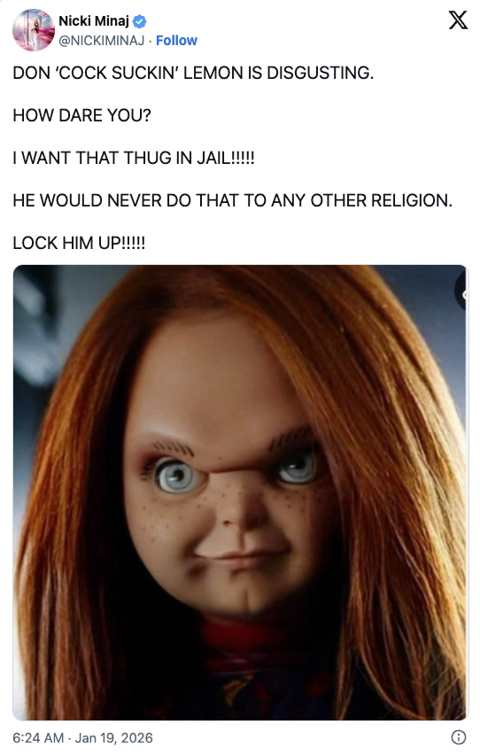 Minaj was not the only public figure to criticize Lemon. Harmeet Dhillon, the Justice Department’s assistant attorney general for civil rights, also warned Lemon on X, arguing that houses of worship are protected spaces under federal law and not appropriate venues for protest. “A house of worship is not a public forum for your protest,” Dhillon wrote, adding that such actions may carry criminal and civil consequences.