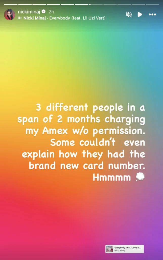 Taking to Instagram, Nicki shared a series of posts accusing multiple people of making unauthorized charges to her Amex card, totaling tens of thousands of dollars.
