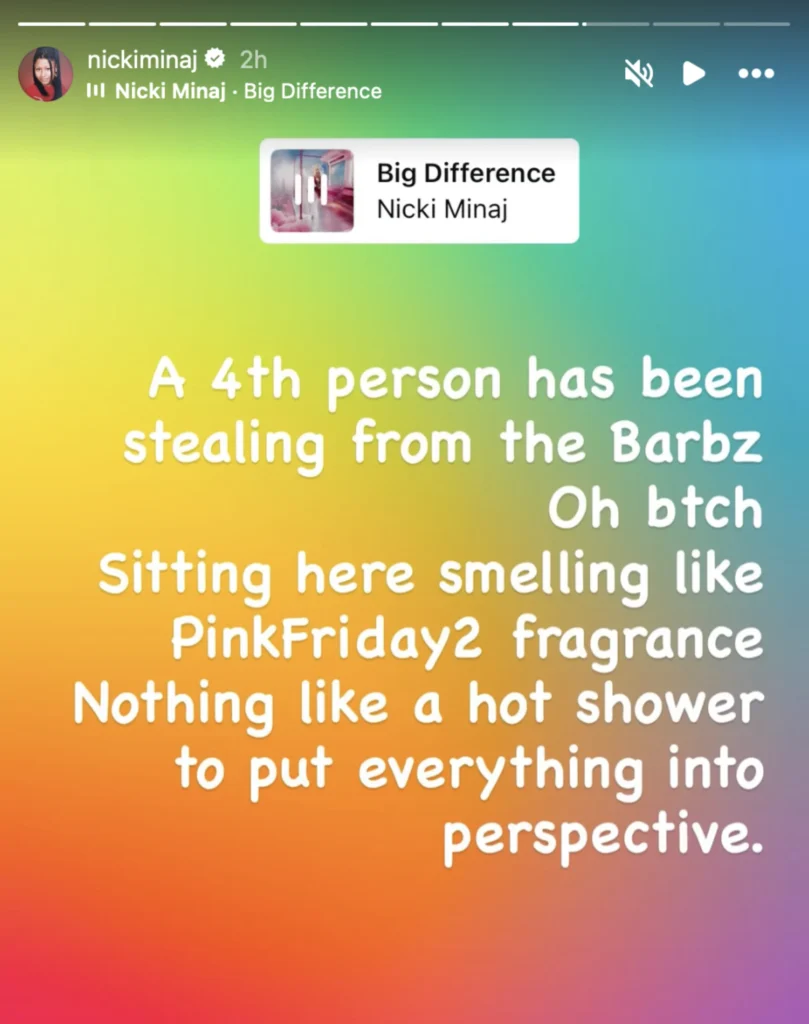 Despite the chaos, Nicki kept her signature humor intact, ending her posts by saying she was “sitting here smelling like Pink Friday 2 fragrance” and taking a hot shower to put things “into perspective.”