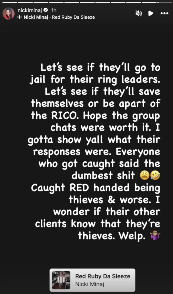 In another story, Nicki hinted that the culprits might face serious criminal charges, possibly under a RICO investigation.