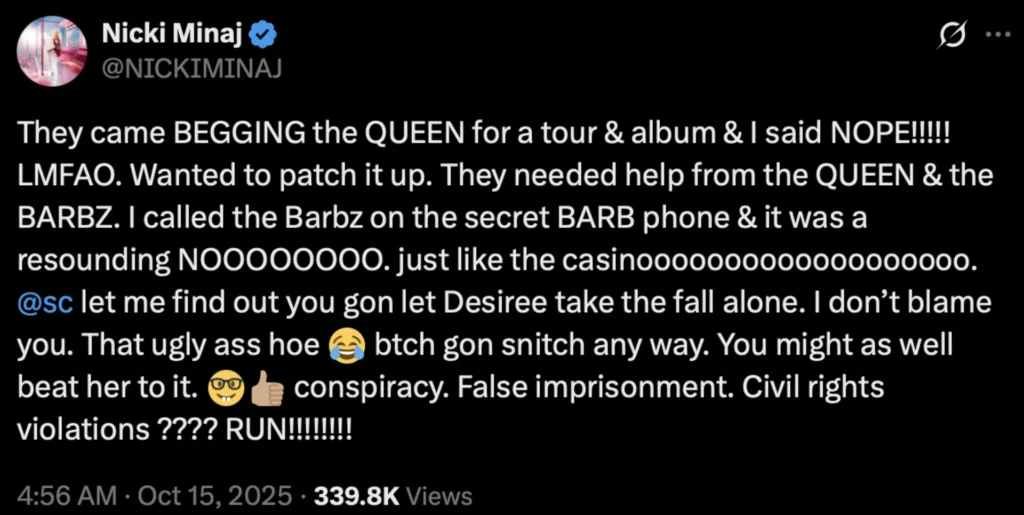 “They came BEGGING the QUEEN for a tour & album & I said NOPE!!!!! LMFAO. Wanted to patch it up. They needed help from the QUEEN & the BARBZ.”