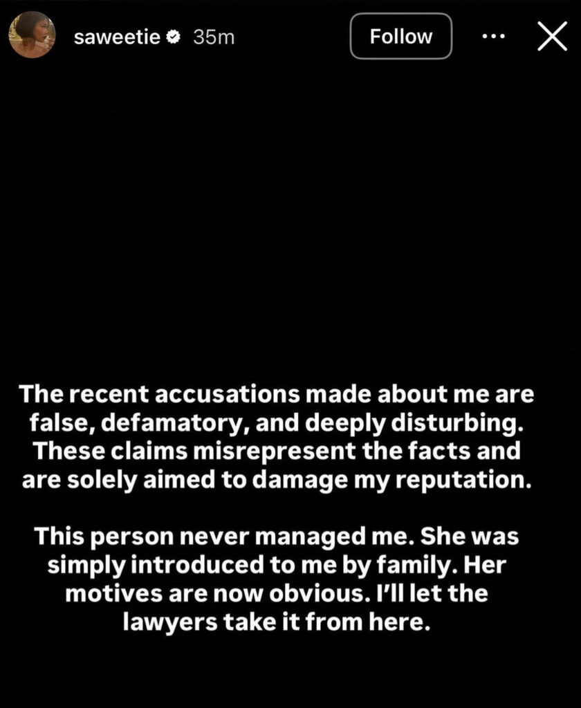 Saweetie wasted no time responding to the controversy. Taking to her Instagram Story, the Grammy-nominated artist firmly denied all allegations and announced that she’s bringing in her legal team to handle the situation.